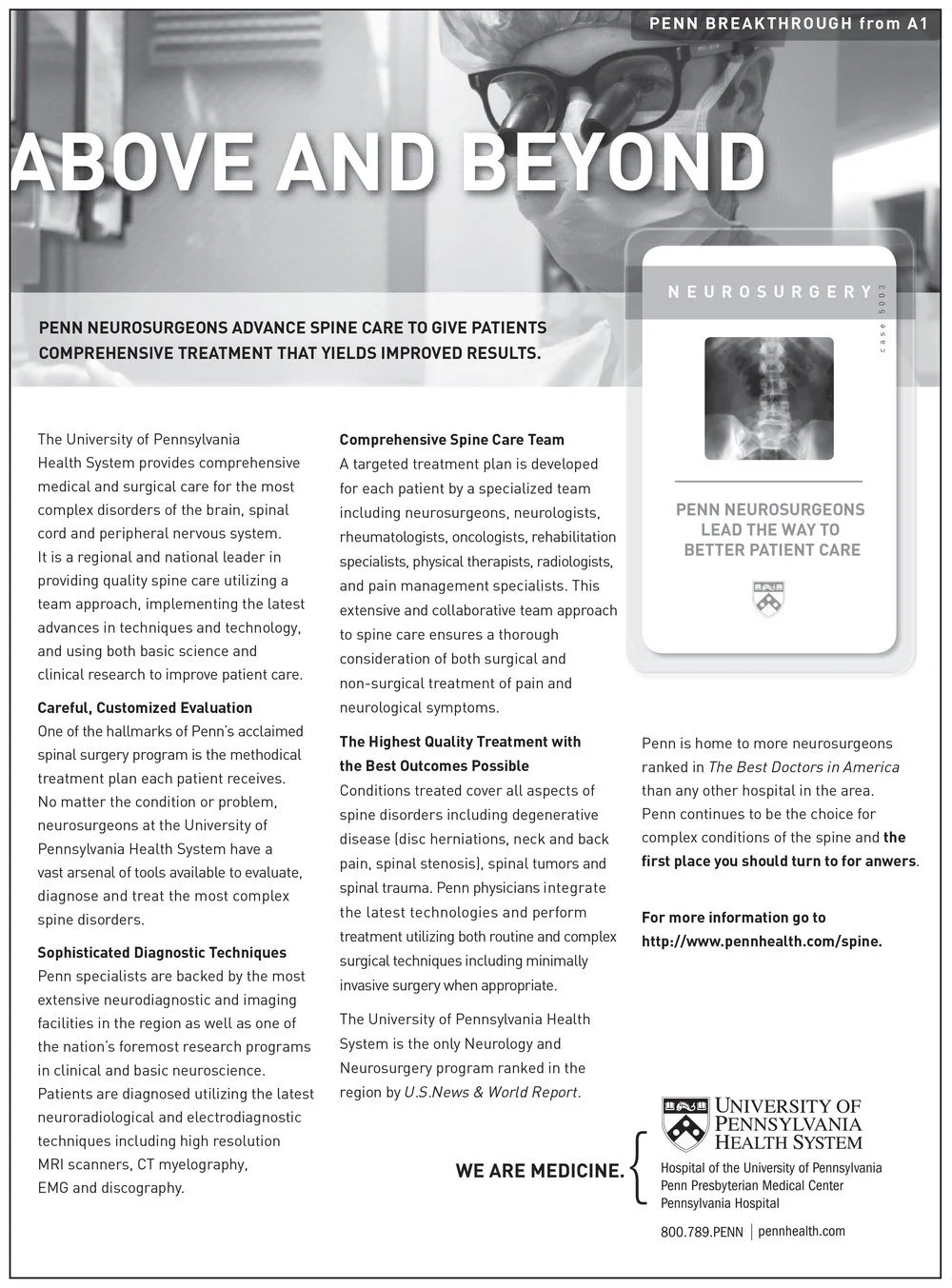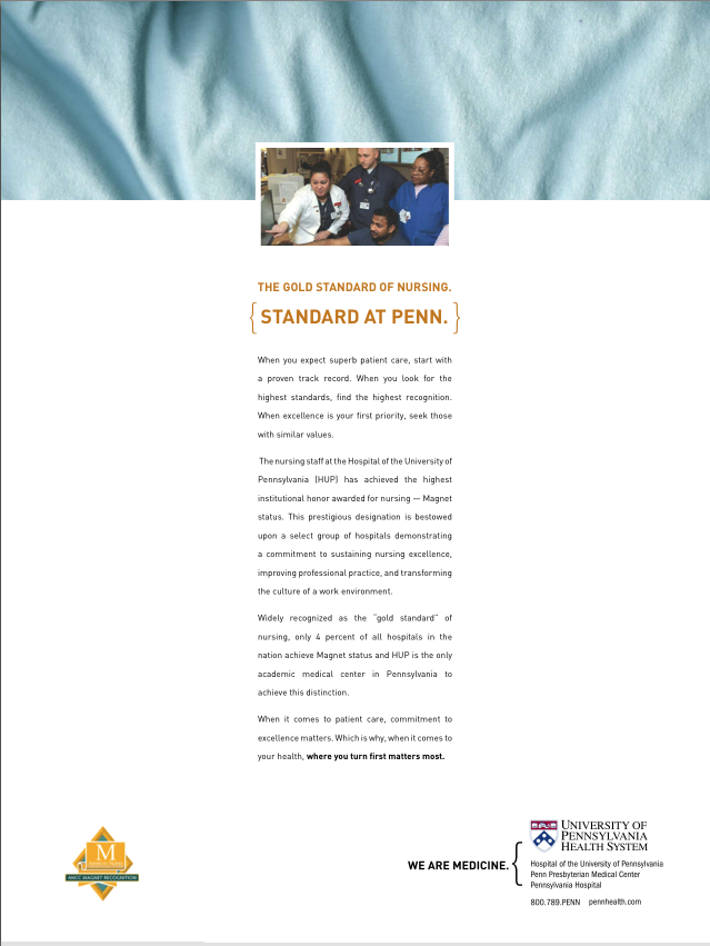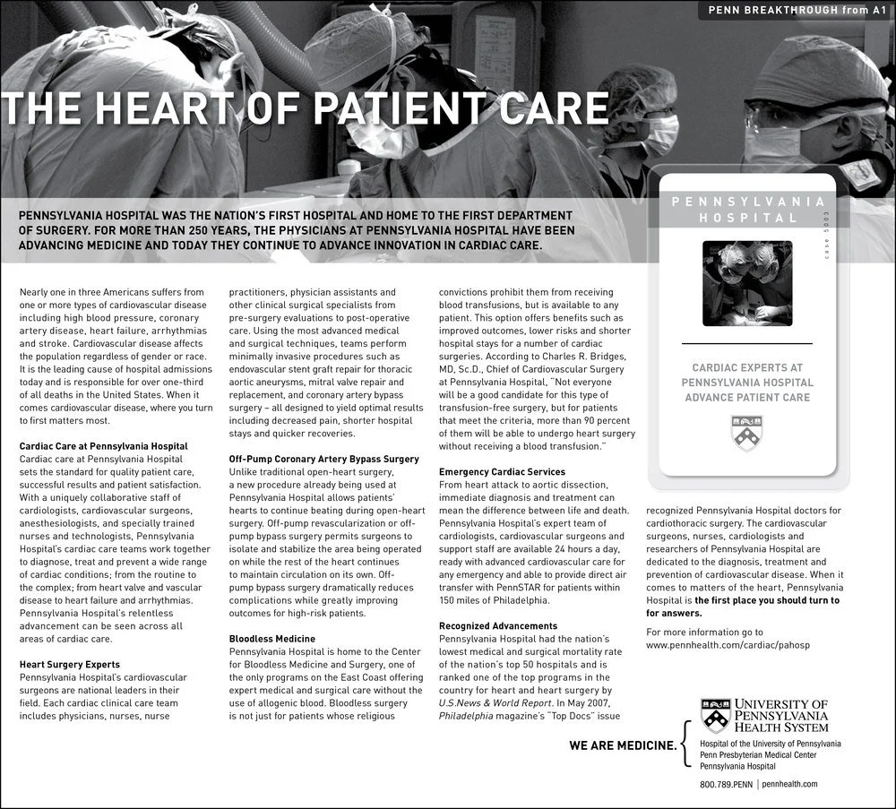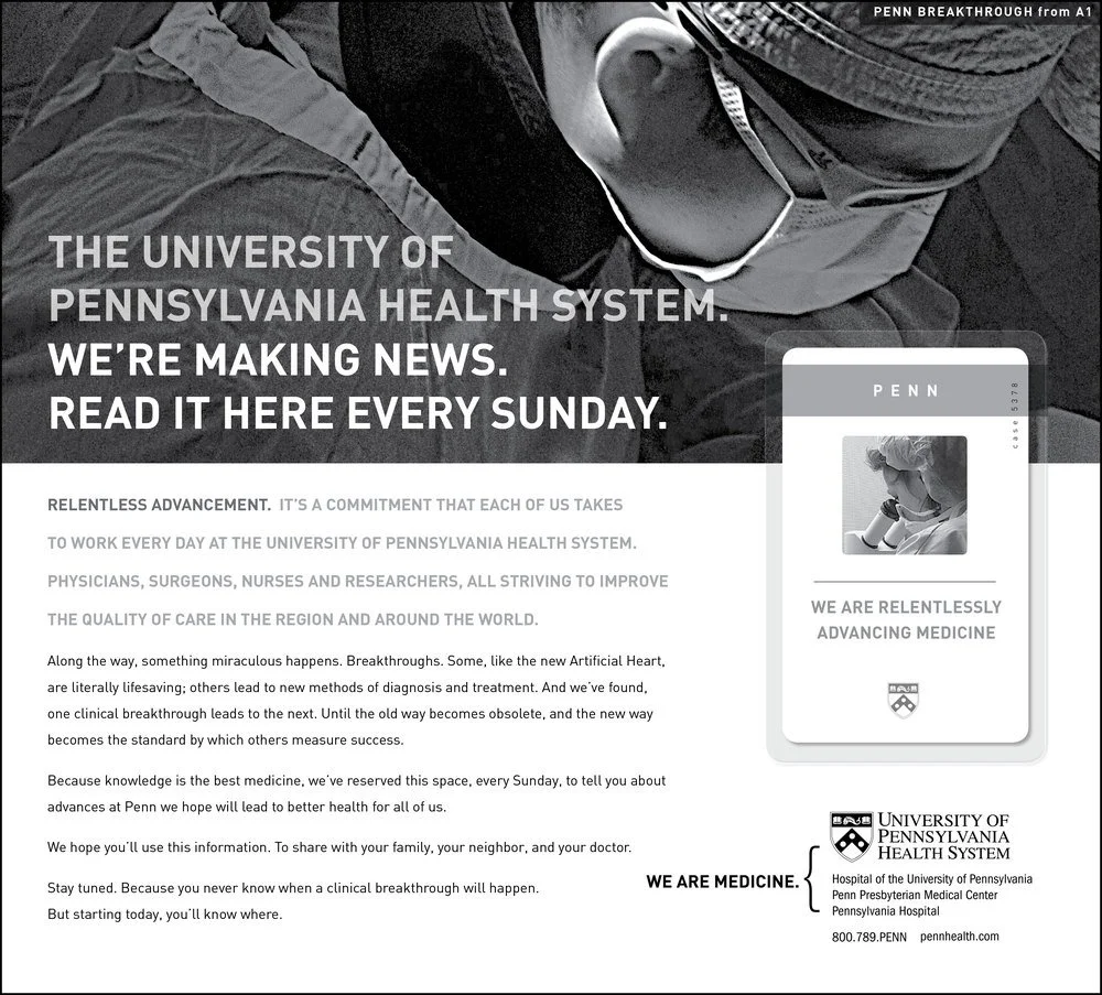 THE CAMPAIGN We created a campaign that ran every Sunday in the Philadelphia Inquirer and consisted of a small ad on the front page (the first time that’s ever been done) that reported a breakthrough from the expert doctors at Penn and led readers to a more in-depth piece a few pages in. Admittedly, the articles are rather dry reading.